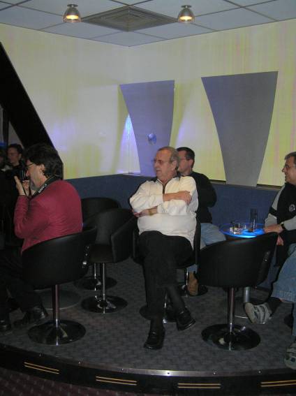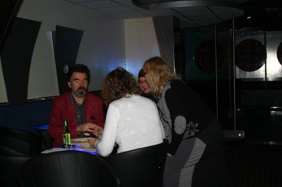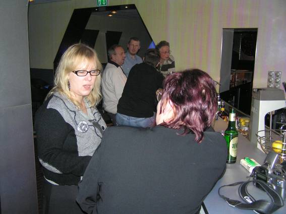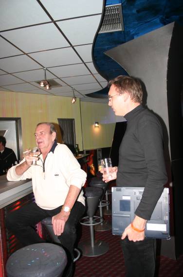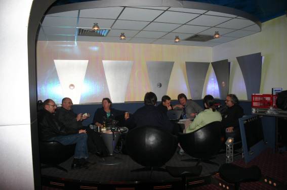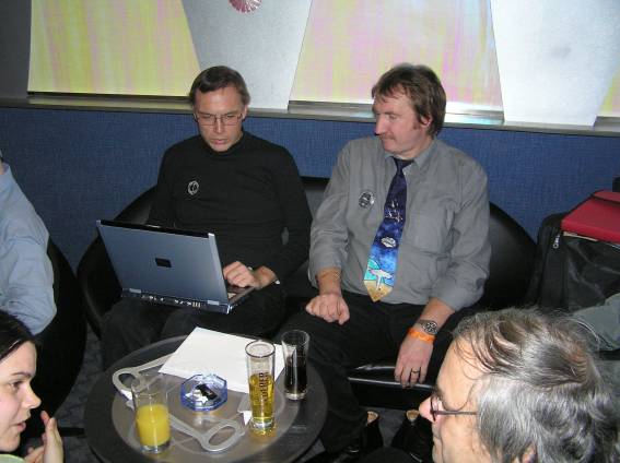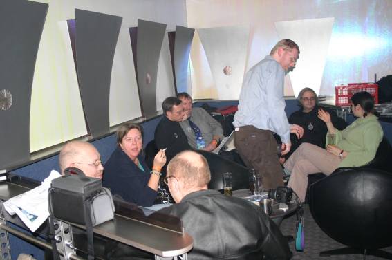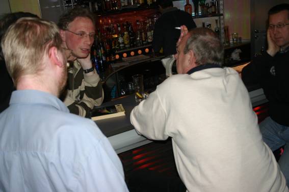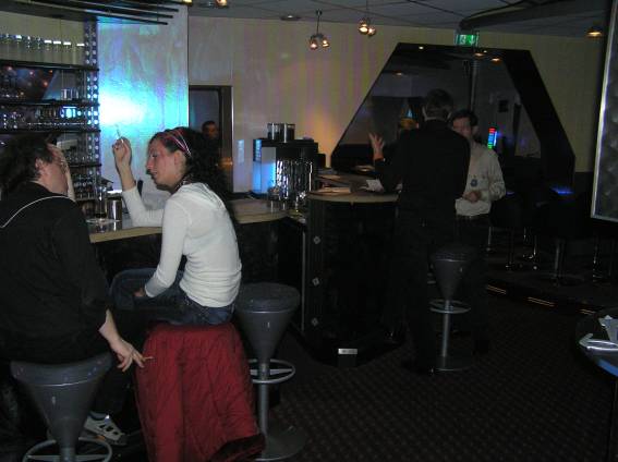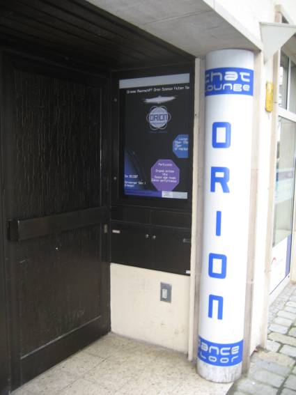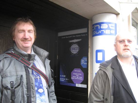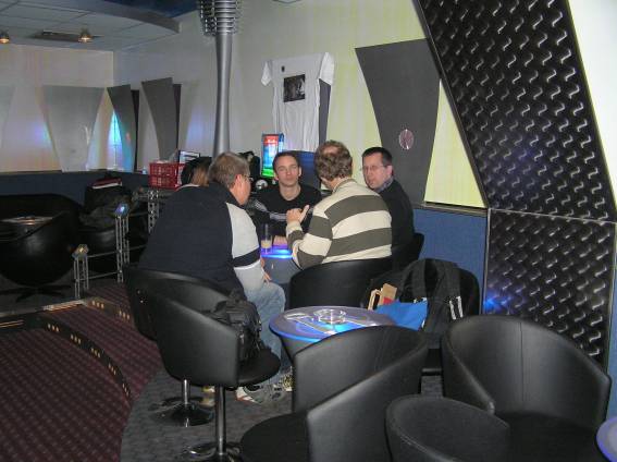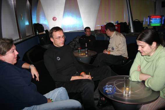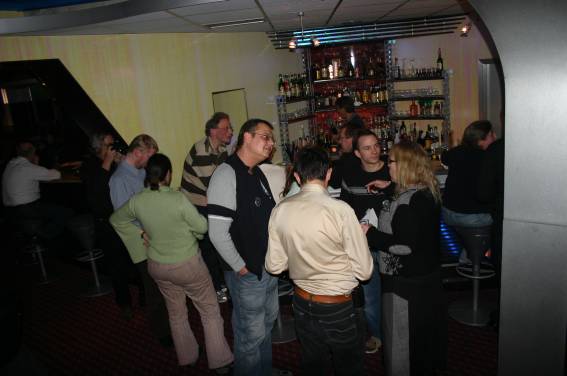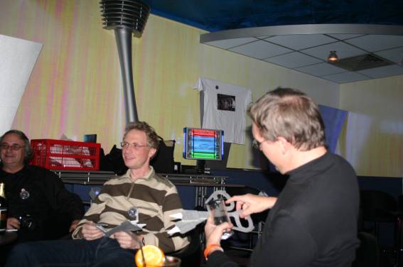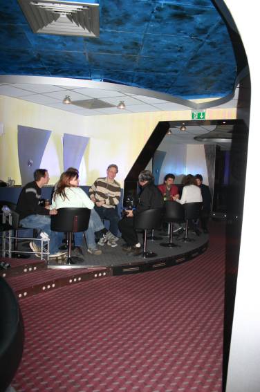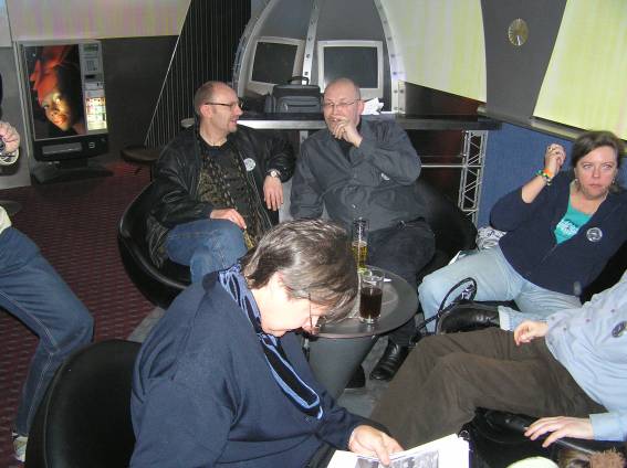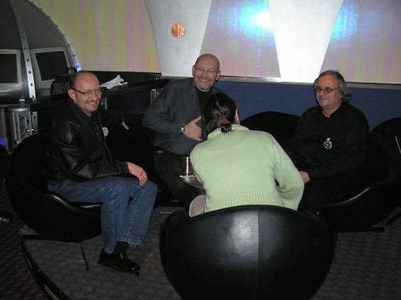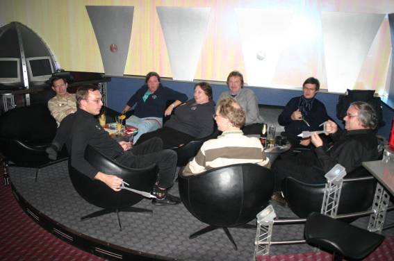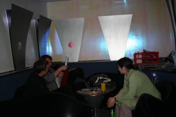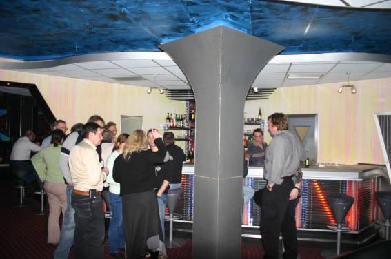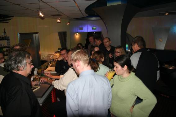 Außer den eingefleischten "Orioniken" waren auch noch Freunde vom Perry Rhodan Stammtisch Nürnberg der ARGE FESTAK und vom Perry Rhodan Stammtisch München ERNST ELLERT gekommen. Kleine Grüppchen belegten dann die Sitzplätze oder trafen sich an der Bar. Es wurde gefachsimpelt, Neuigkeiten ausgetauscht oder einfach nur ein Drink genossen. Am Computer-Ei konnte man ins Internet gehen oder im Nebenraum einen Videoclip oder einen Film betrachten.