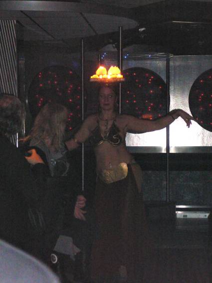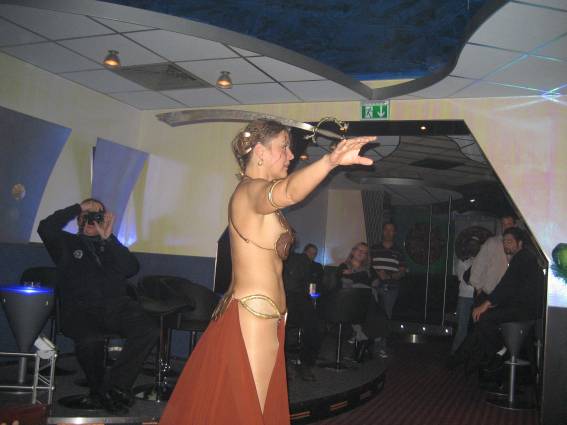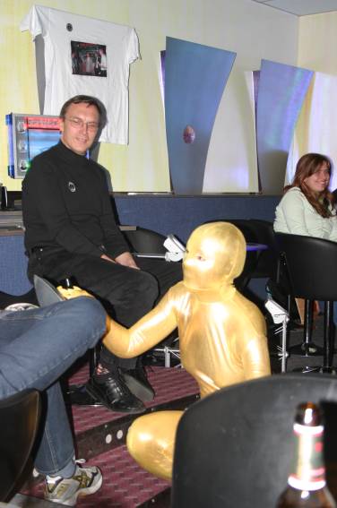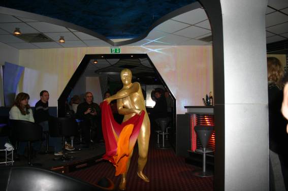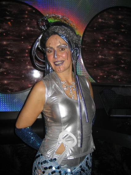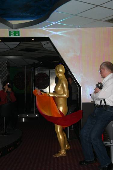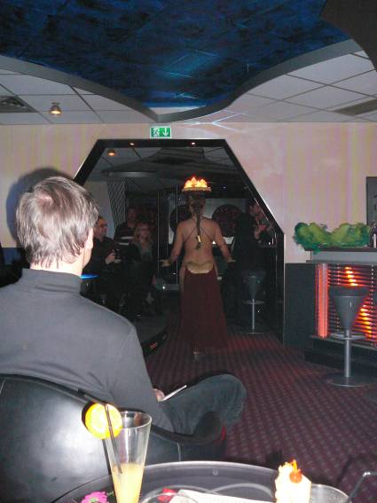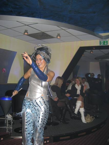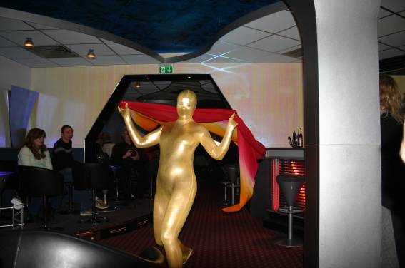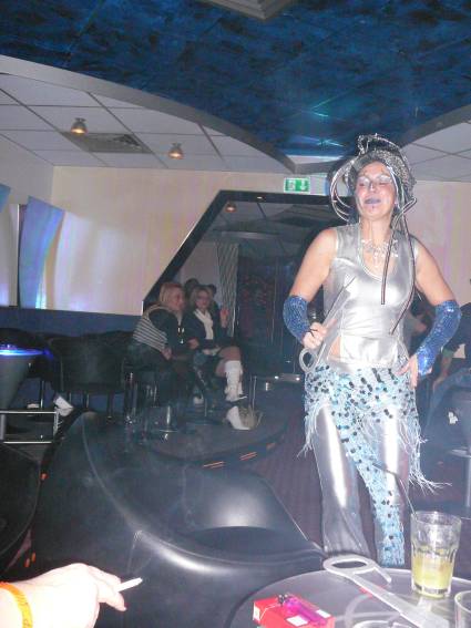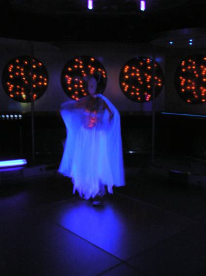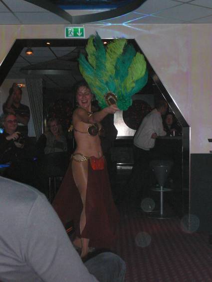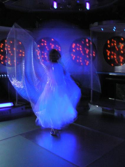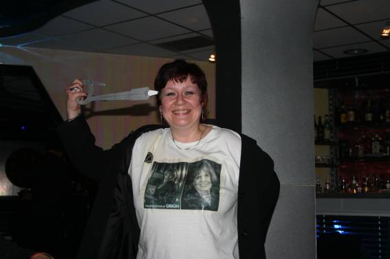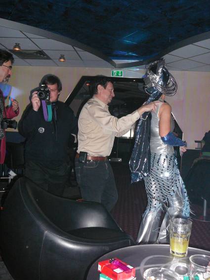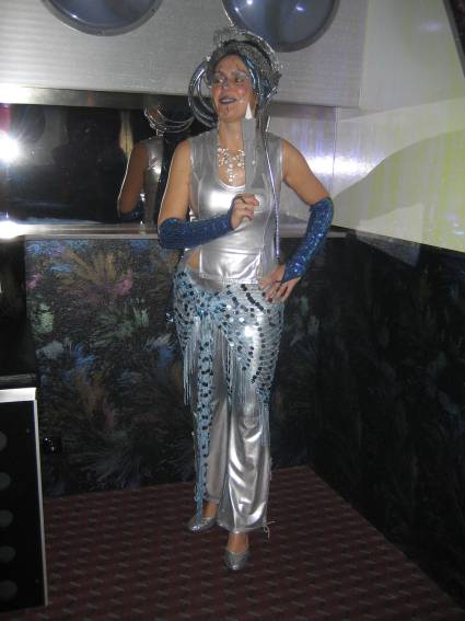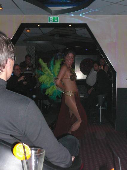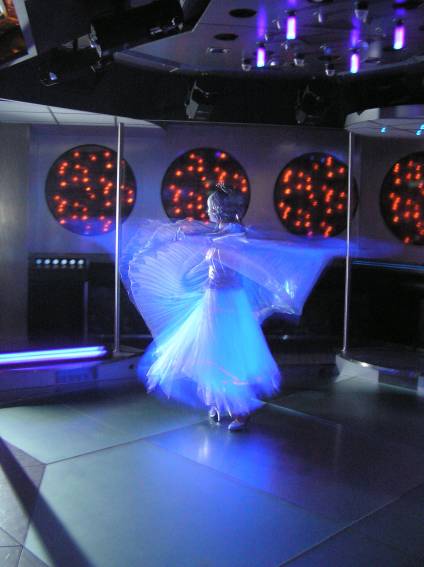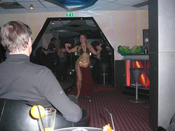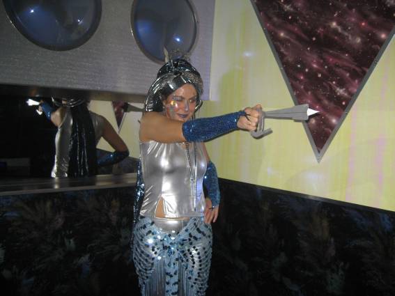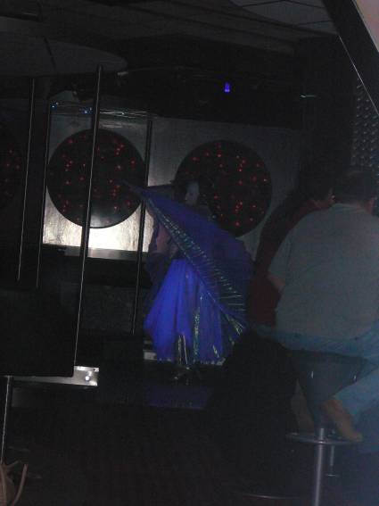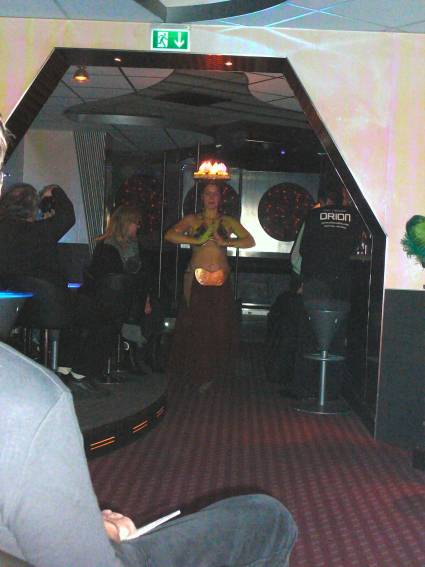 Zum Schluss, so gegen 23:00 Uhr hat sich dann ein Alien im Transporterraum der Enterprise in einer blauen Lichterscheinung materialisiert und versucht die Besatzung durch ihren Tanz zum Mitmachen zu bewegen. Der Erfolg war zwar auf Grund der hohen Massenträgheit der Besatzung nicht berauschend, aber die Performance von Sulamid war über jeden Zweifel erhaben und ausgezeichnet. Die letzten "Orioniken", die keine lange Heimreise mehr antreten mussten, verabschiedeten sich so gegen 01:30 Uhr aus der Orion-Bar. Ich denke der Abend war eine rundum gelungene Veranstaltung für die wir der Veranstalterin Rita Grünbein, Dagmar Rosenbauer und dem Personal der Orion-Bar herzlich danken möchten.