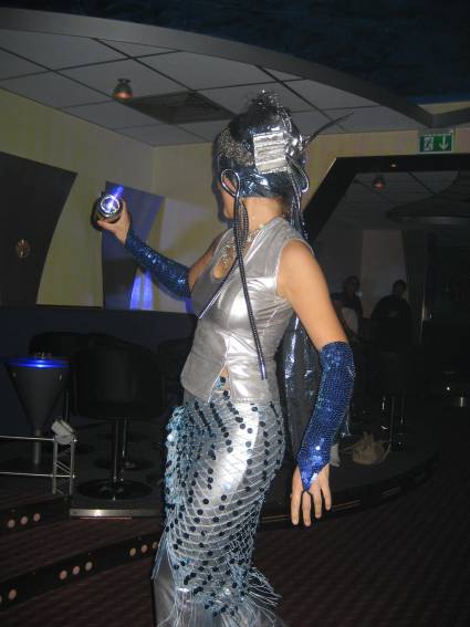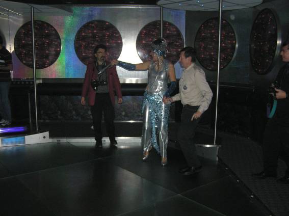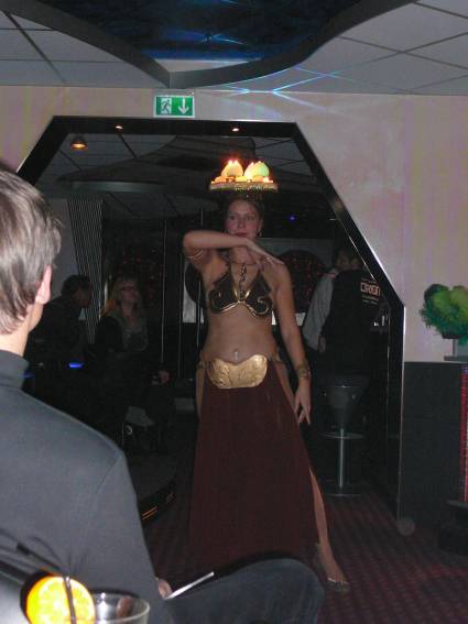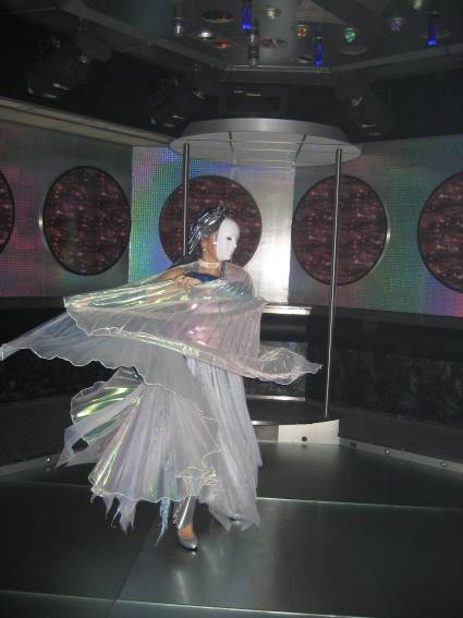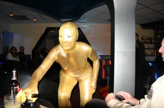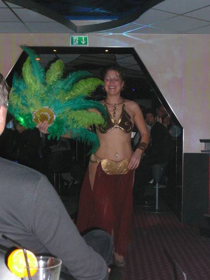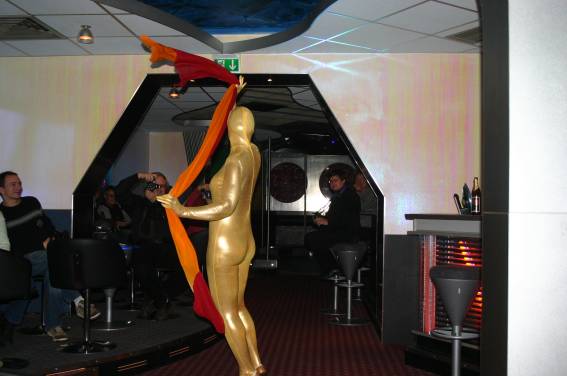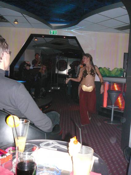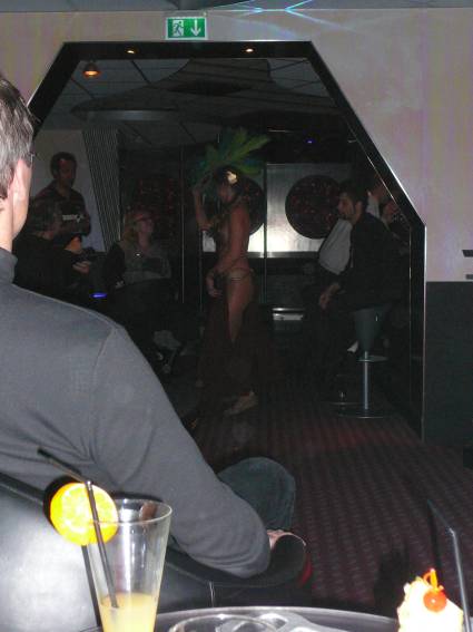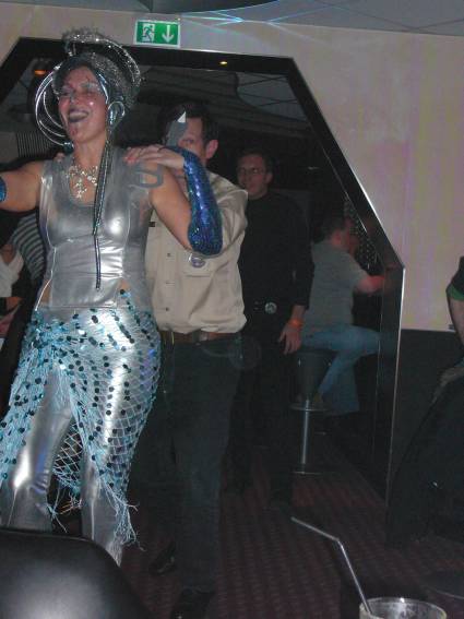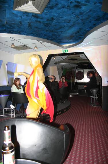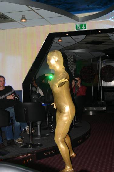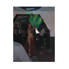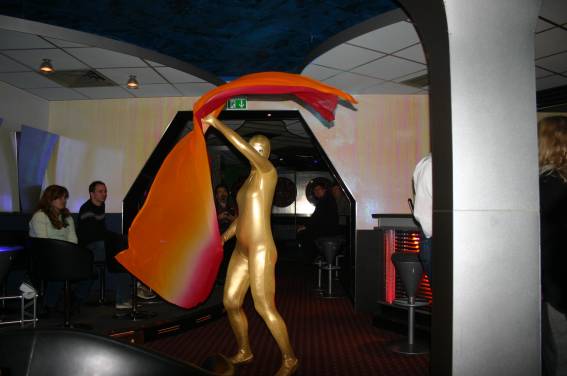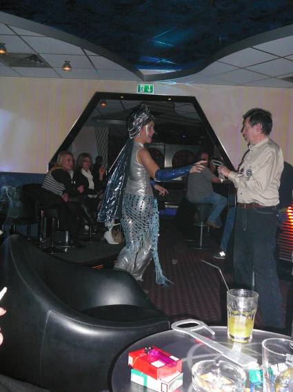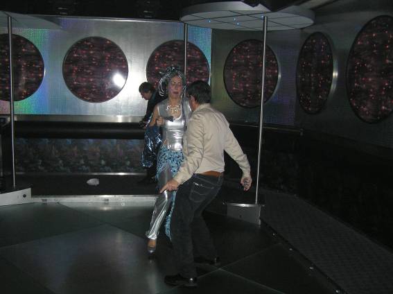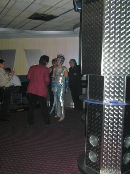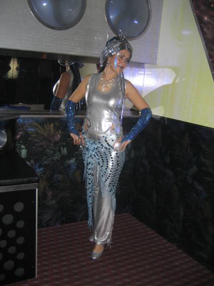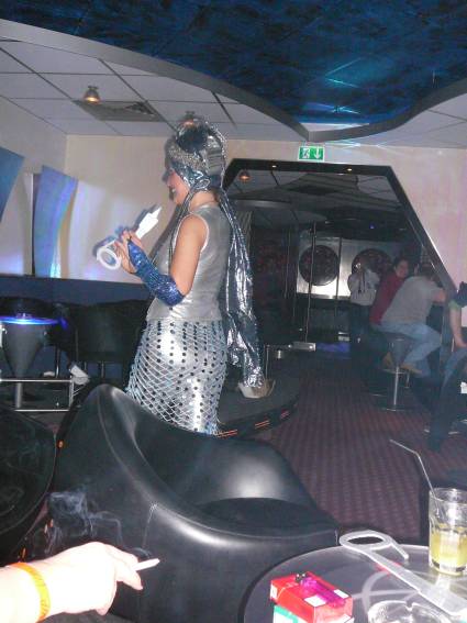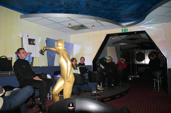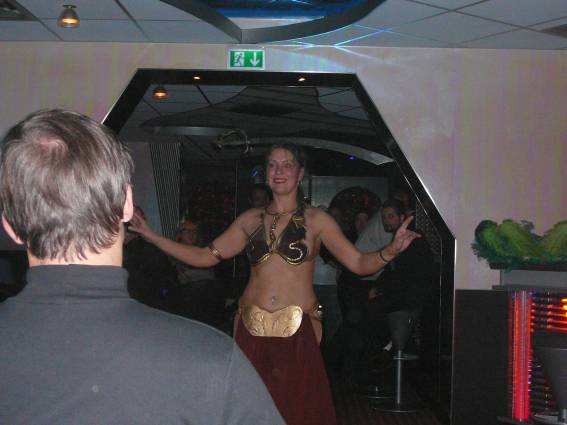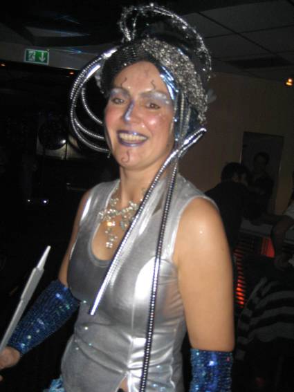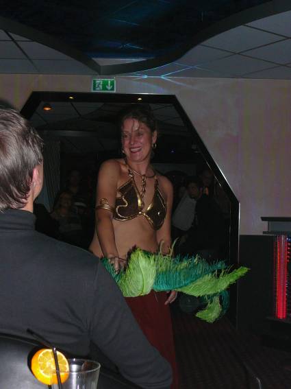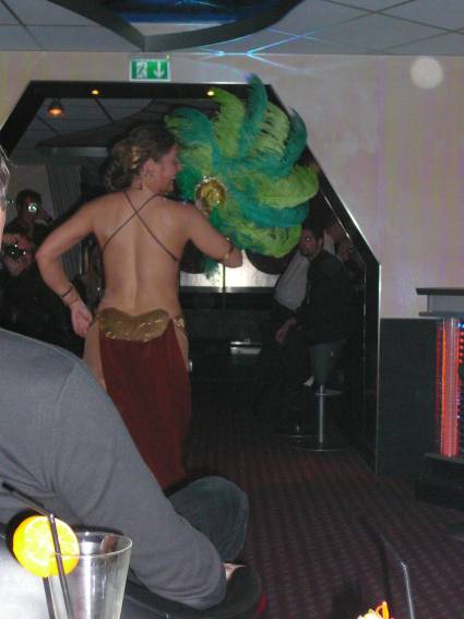 Zum Schluss, so gegen 23:00 Uhr hat sich dann ein Alien im Transporterraum der Enterprise in einer blauen Lichterscheinung materialisiert und versucht die Besatzung durch ihren Tanz zum Mitmachen zu bewegen. Der Erfolg war zwar auf Grund der hohen Massenträgheit der Besatzung nicht berauschend, aber die Performance von Sulamid war über jeden Zweifel erhaben und ausgezeichnet. Die letzten "Orioniken", die keine lange Heimreise mehr antreten mussten, verabschiedeten sich so gegen 01:30 Uhr aus der Orion-Bar. Ich denke der Abend war eine rundum gelungene Veranstaltung für die wir der Veranstalterin Rita Grünbein, Dagmar Rosenbauer und dem Personal der Orion-Bar herzlich danken möchten.