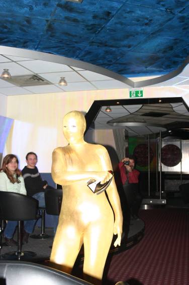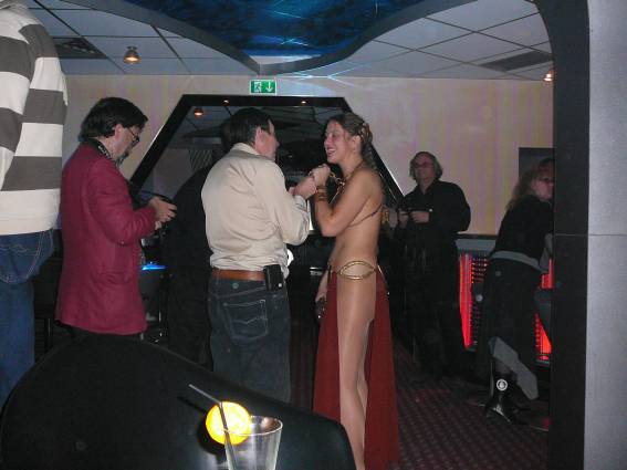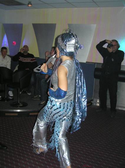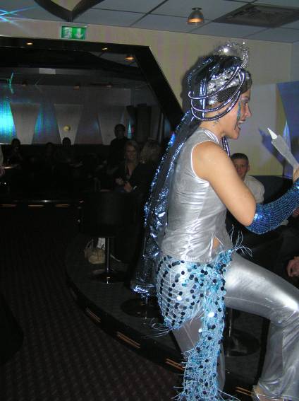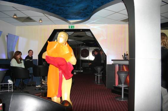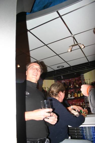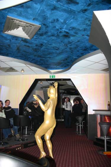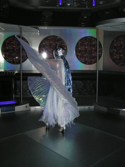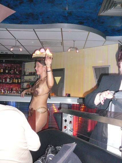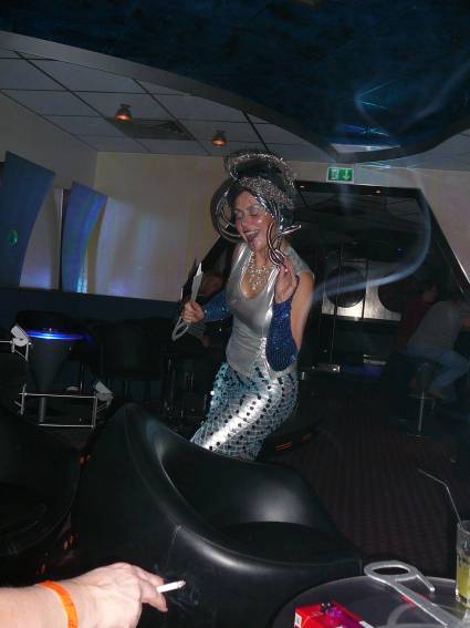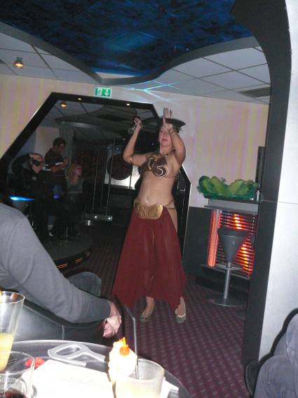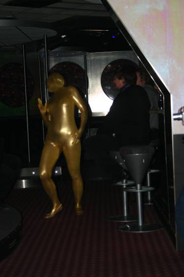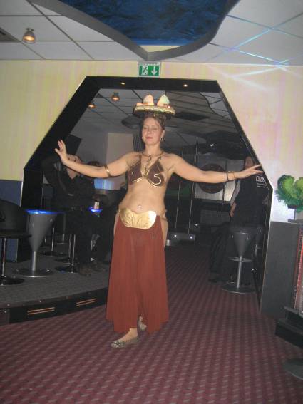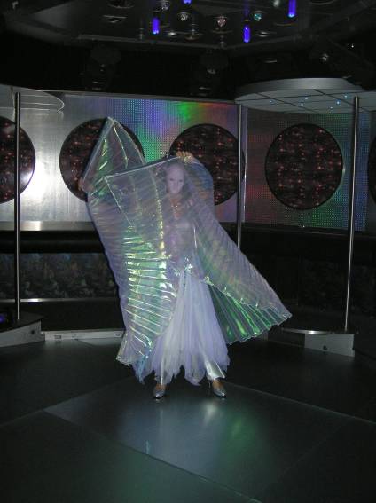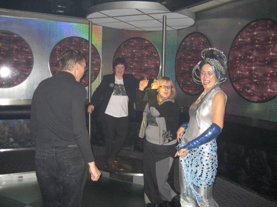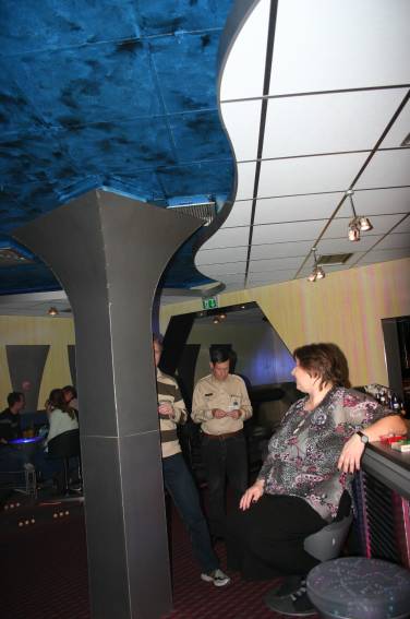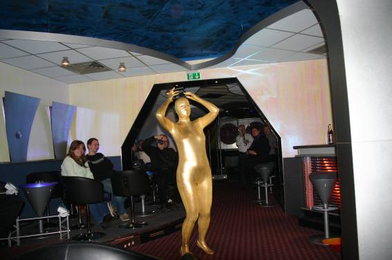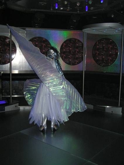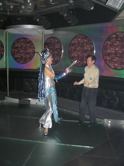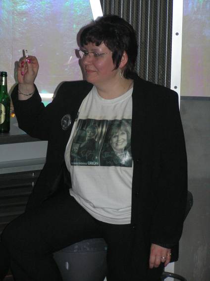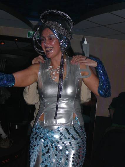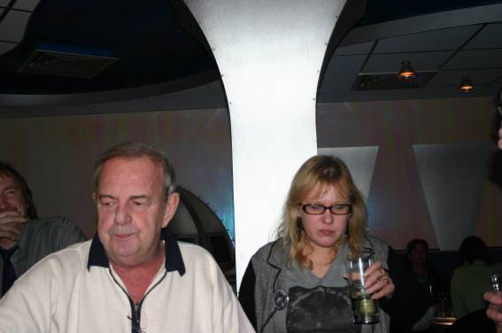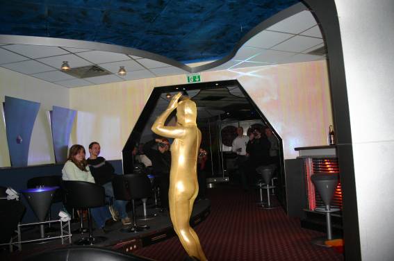 Zum Schluss, so gegen 23:00 Uhr hat sich dann ein Alien im Transporterraum der Enterprise in einer blauen Lichterscheinung materialisiert und versucht die Besatzung durch ihren Tanz zum Mitmachen zu bewegen. Der Erfolg war zwar auf Grund der hohen Massenträgheit der Besatzung nicht berauschend, aber die Performance von Sulamid war über jeden Zweifel erhaben und ausgezeichnet. Die letzten "Orioniken", die keine lange Heimreise mehr antreten mussten, verabschiedeten sich so gegen 01:30 Uhr aus der Orion-Bar. Ich denke der Abend war eine rundum gelungene Veranstaltung für die wir der Veranstalterin Rita Grünbein, Dagmar Rosenbauer und dem Personal der Orion-Bar herzlich danken möchten.