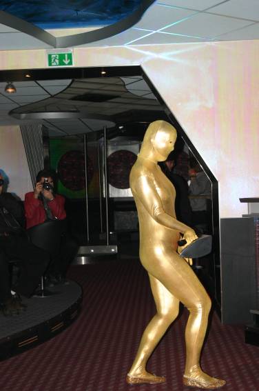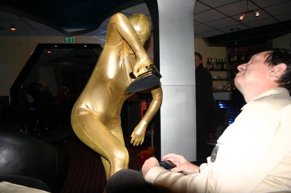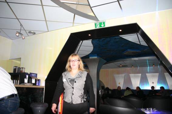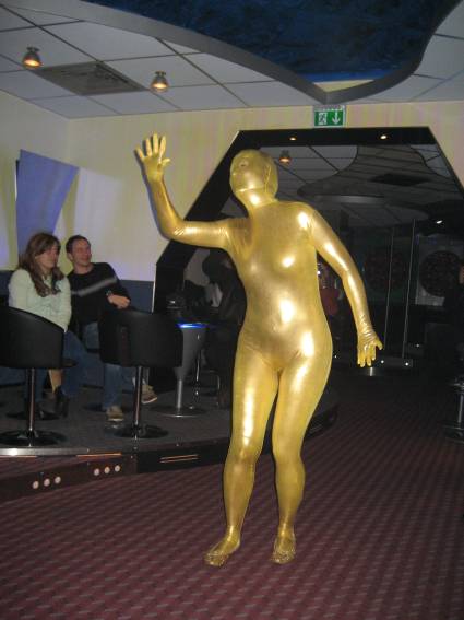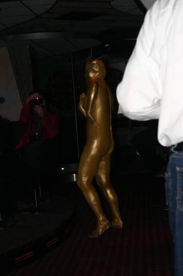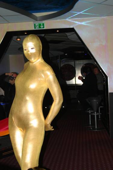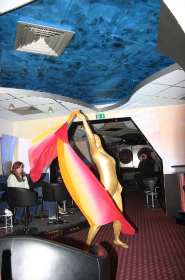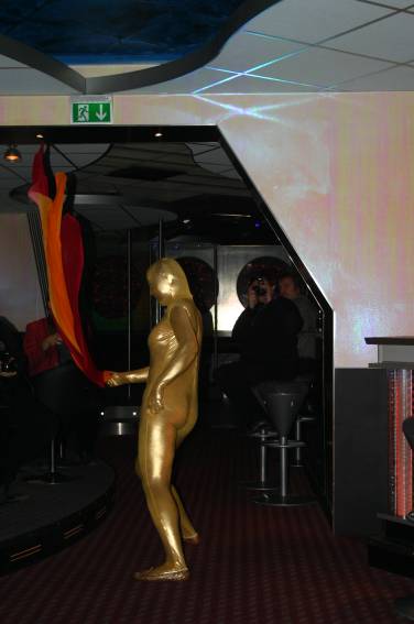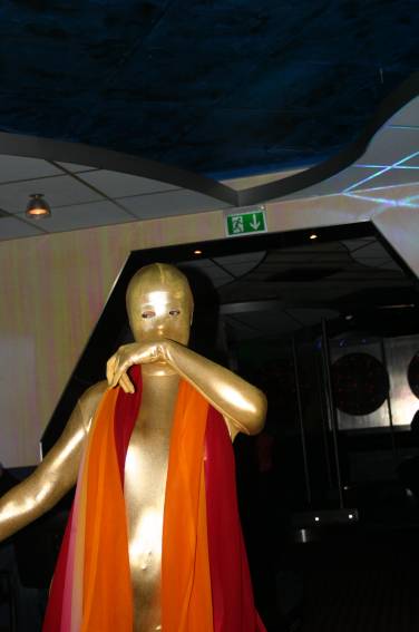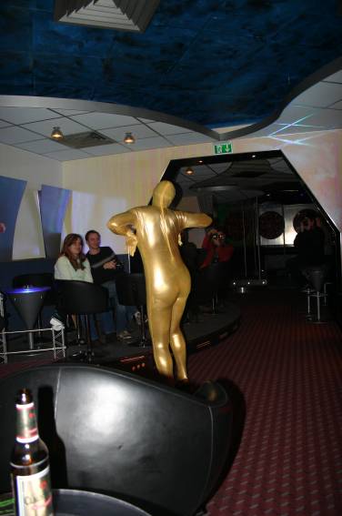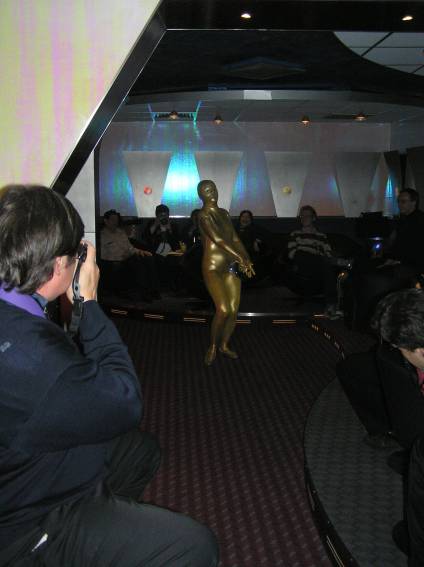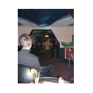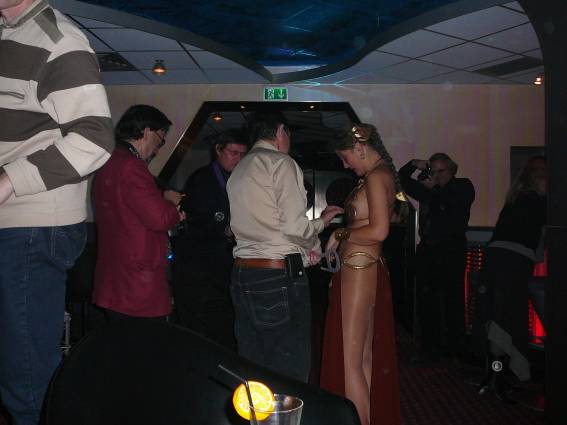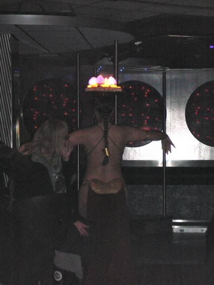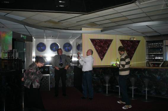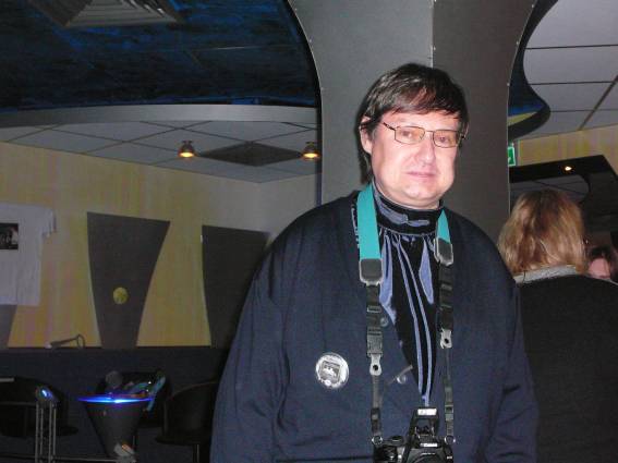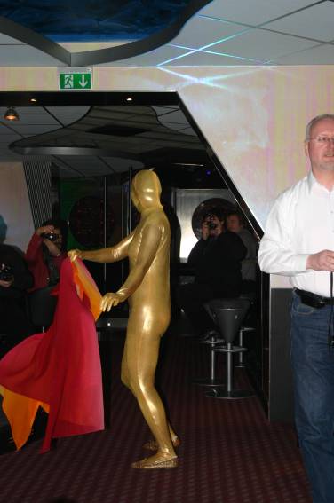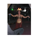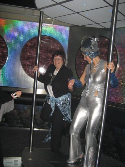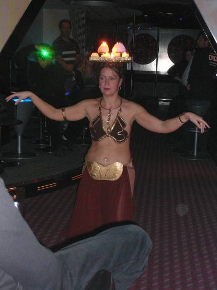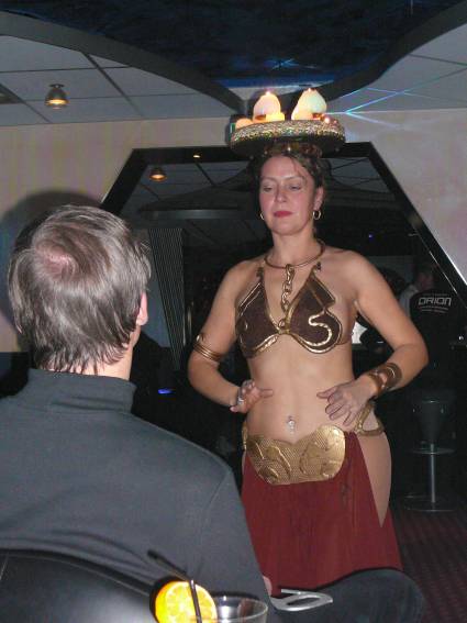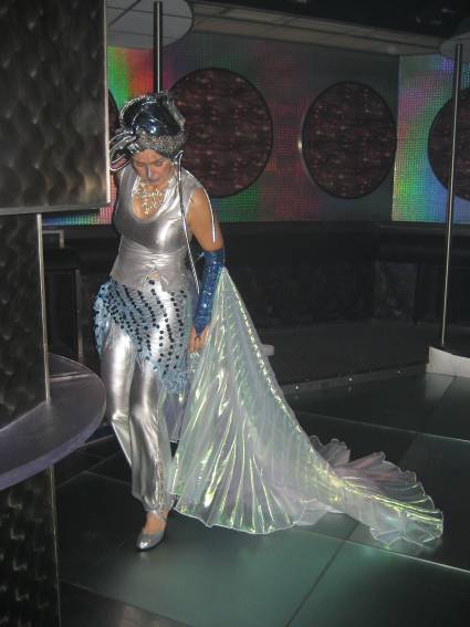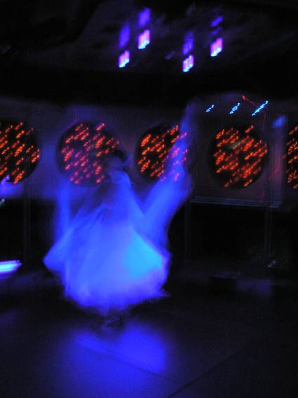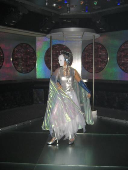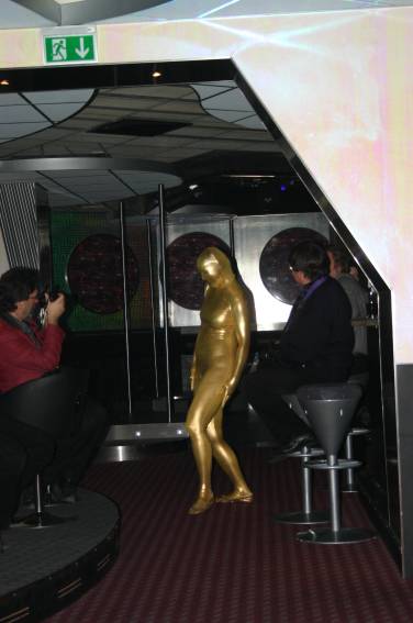 Zum Schluss, so gegen 23:00 Uhr hat sich dann ein Alien im Transporterraum der Enterprise in einer blauen Lichterscheinung materialisiert und versucht die Besatzung durch ihren Tanz zum Mitmachen zu bewegen. Der Erfolg war zwar auf Grund der hohen Massenträgheit der Besatzung nicht berauschend, aber die Performance von Sulamid war über jeden Zweifel erhaben und ausgezeichnet. Die letzten "Orioniken", die keine lange Heimreise mehr antreten mussten, verabschiedeten sich so gegen 01:30 Uhr aus der Orion-Bar. Ich denke der Abend war eine rundum gelungene Veranstaltung für die wir der Veranstalterin Rita Grünbein, Dagmar Rosenbauer und dem Personal der Orion-Bar herzlich danken möchten.