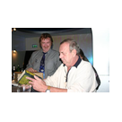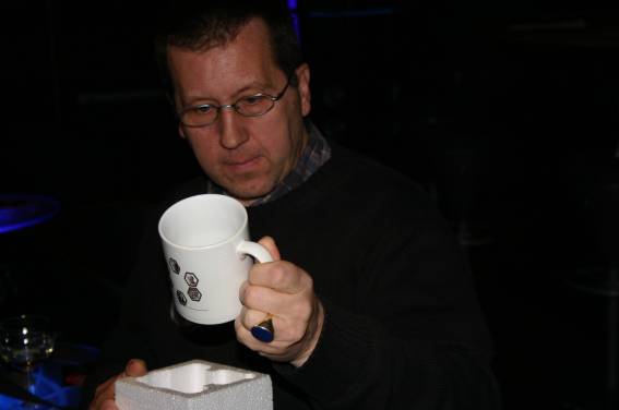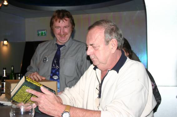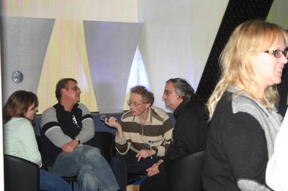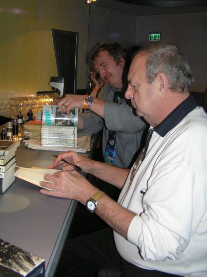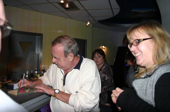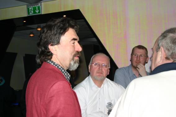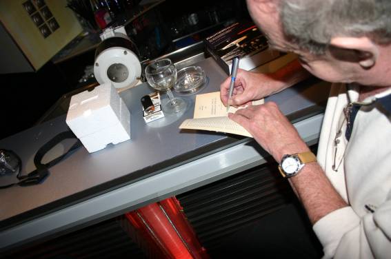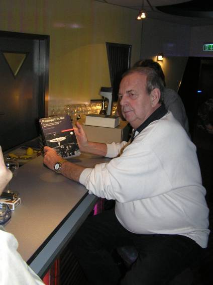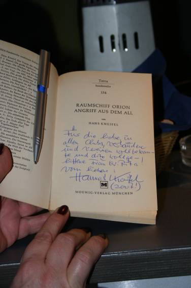 Irgendwann am Nachmittag traf dann auch der Ehrengast, Hanns Kneifel ein. Er wurde mit großem Beifall begrüßt und schon bald bildete sich eine Diskussionsgruppe um den Gast. Man konnte sich natürlich auch ein Autogramm holen (wobei einer ganz besonders hinlangte).